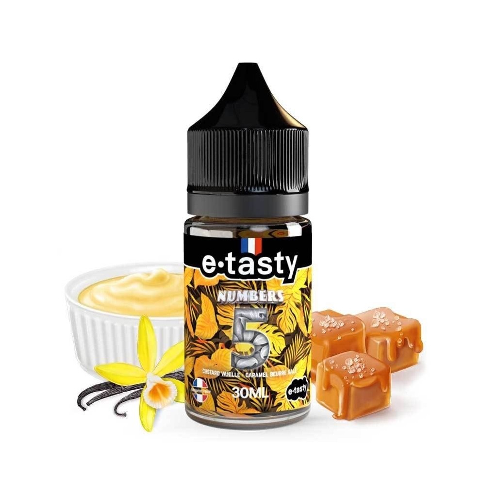 E-Tasty est un acteur majeur dans le monde de la vape : pour répondre aux attentes de ses fans, le fabricant a développé l'arôme concentré Numbers 5. Faites le plein de douceur et de saveurs avec cette délicieuse custard. Epaisse et réconfortante, cette dernière dégage de succulentes saveurs de vanille et de caramel au beurre salé. Avec cette mixture DIY, E-Tasty est assuré de satisfaire les vapoteurs les plus exigeants.